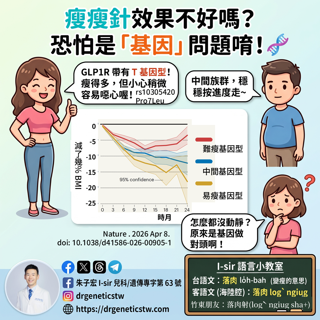 ![替代文字 (Alt Text): 1:1 的醫療衛教圖。主標題為「瘦瘦針效果不好嗎?恐怕是「基因」問題唷!🧬」。正中央是來自 Nature 期刊(2026/04/08)的折線圖,顯示三種不同基因組的減重預測曲線。圖表周圍有三個人物:最左邊是瘦下來開心比讚的女性( dialogue bubble: GLP1R 帶有 T 基因型!落肉(lo̍h-bah)最多,但小心稍微容易噁心喔!);最右邊上是沒什麼變化中間族群的男性( dialogue bubble: 中間族群,穩穩按進度走~);最右邊下是滿頭問號沒瘦的女性( dialogue bubble: 怎麼都沒動靜?原來是基因做對頭啊!)。下方有來源標註。右下角有「I-sir 語言小教室」,標示台語文(源樣黑體)落肉 lo̍h-bah與客語文(海陸腔,源流明體)落肉 logˋ ngiug。左下角有朱醫師大頭照與社群帳號資訊([FB icon] 朱子宏 I-sir 兒科/遺傳專字第 63 號、[IG/Threads icon] drgeneticstw、[網頁 icon](https://i0.wp.com/drgeneticstw.com/wp-content/uploads/2026/04/2026-04-14-Genetics-reveal-why-effects-of-GLP-1-vary-Dr.-Tsir-hong-Tsu-%E6%9C%B1%E5%AD%90%E5%AE%8F%E9%86%AB%E5%B8%AB.png?resize=1024%2C1024&ssl=1)